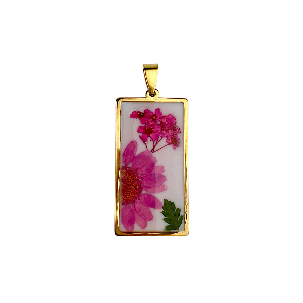 Ciondolo rettangolare con fiori essiccati resinati. Misura 4 x 2 cm. Trattandosi di un prodotto artigianale, possono essere presenti delle piccole bolle d'aria o leggere irregolarità nella resina, segno dell'autenticità e della lavorazione manuale di ogni pezzo.