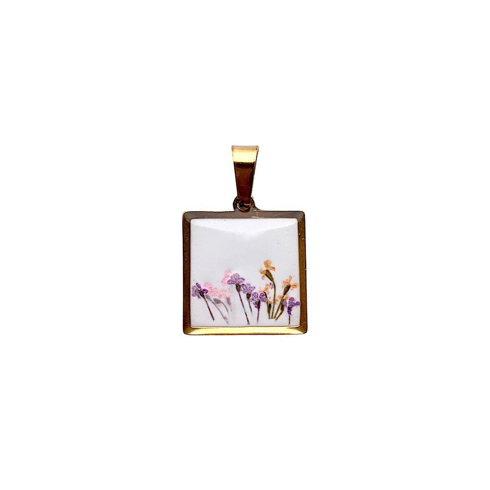 Ciondolo quadrato con mini fiori essiccati resinati. Misura 1,5 x 1,5 cm. Acciaio inossidabile finitura oro. Trattandosi di un prodotto artigianale, possono essere presenti delle piccole bolle d'aria o leggere irregolarità nella resina, segno dell'autenticità e della lavorazione manuale di ogni pezzo.