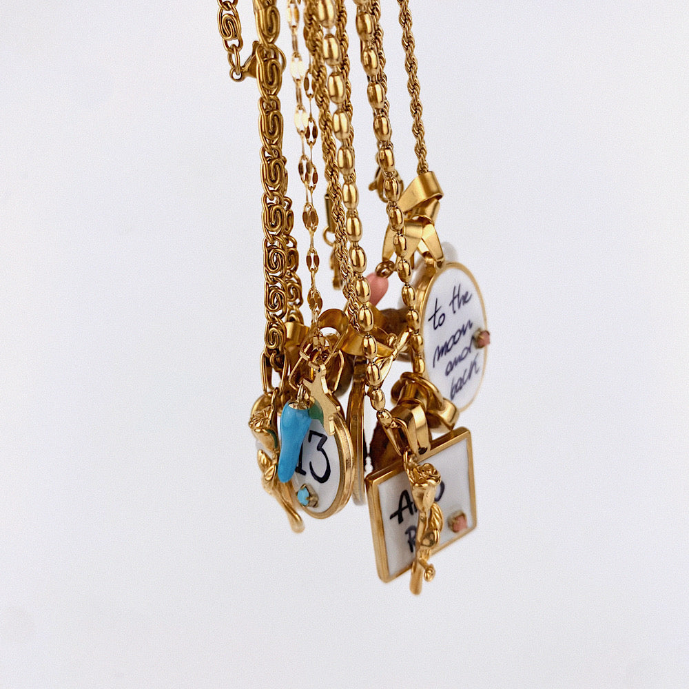 Ciondolo ovale con scritta To The Moon And Back. Misura 2 x 3 cm.