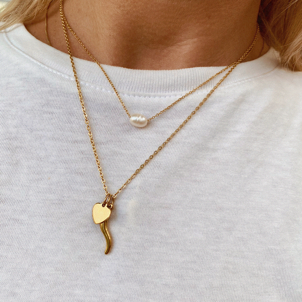 Collana cornetto e cuoricino. Completamente in acciaio inossidabile.