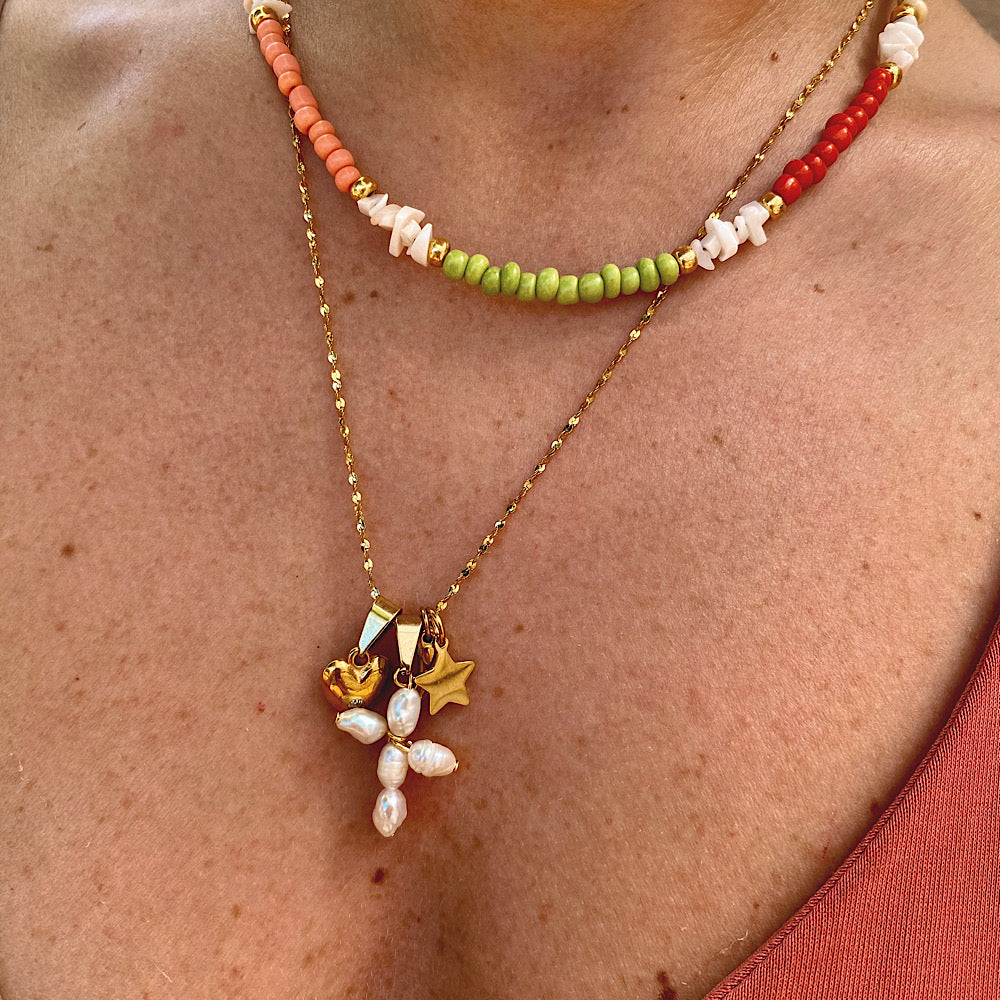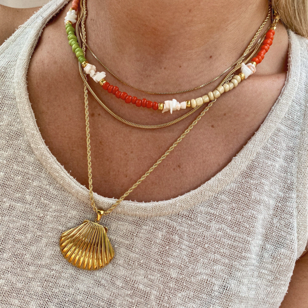 Collana girocollo con perline multicolor e frammenti conchiglia.