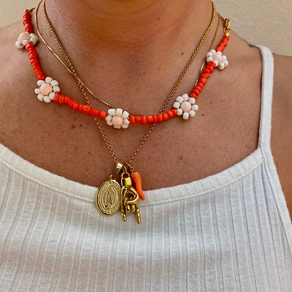 Collana catena rollò con ciondoli. Completamente in acciaio inossidabile finitura oro.