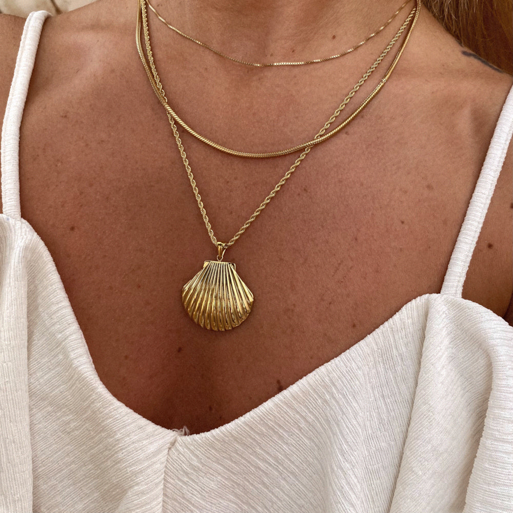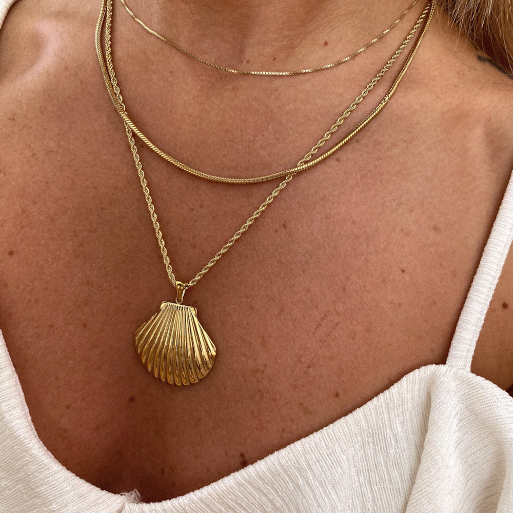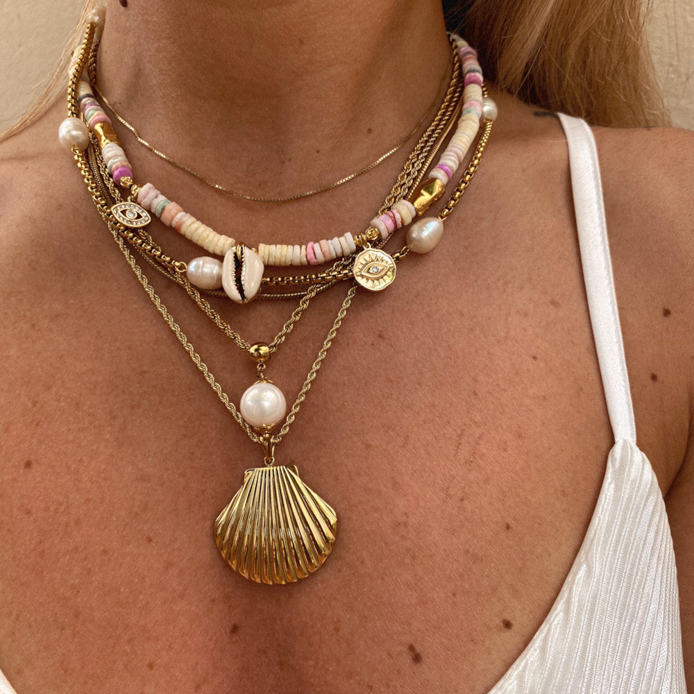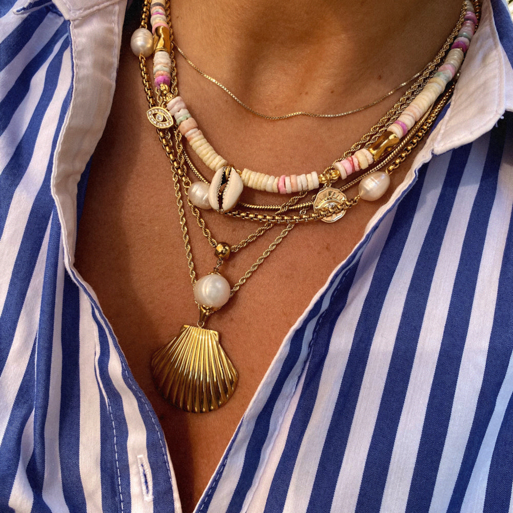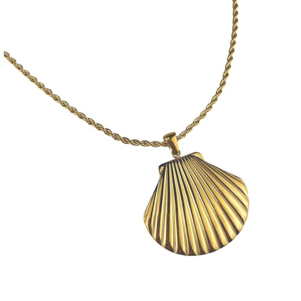 Collana torchon con maxi conchiglia 4 cm. Finitura in acciaio inossidabile.
