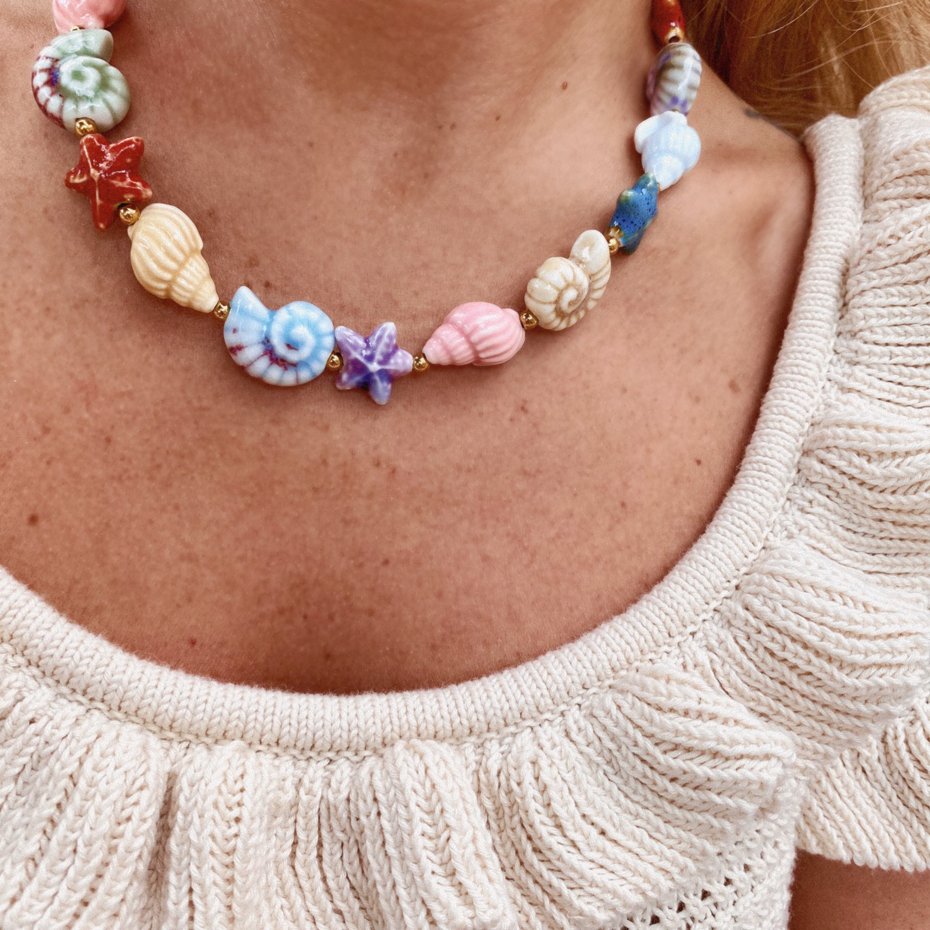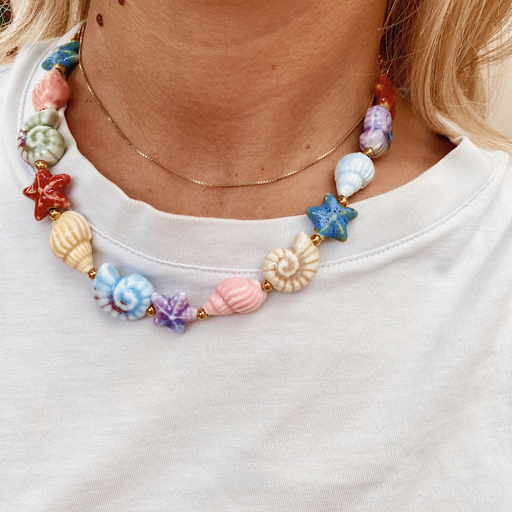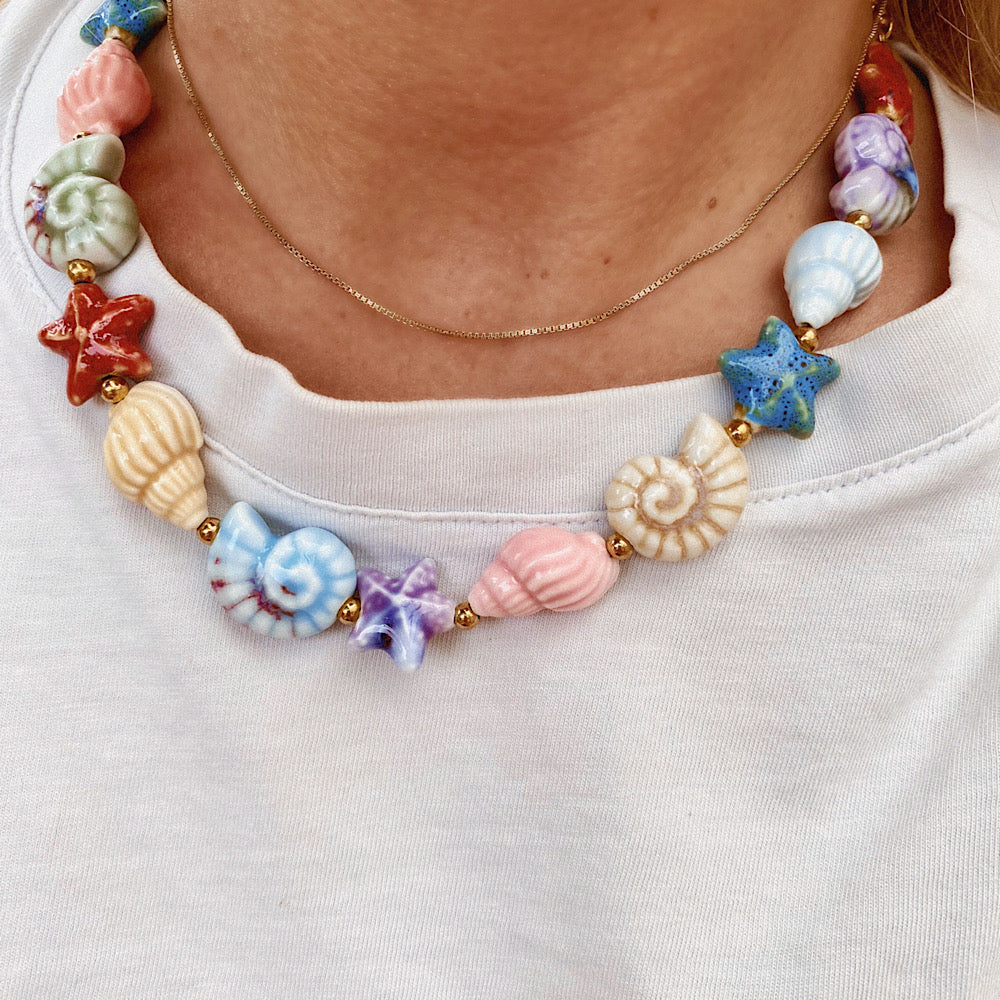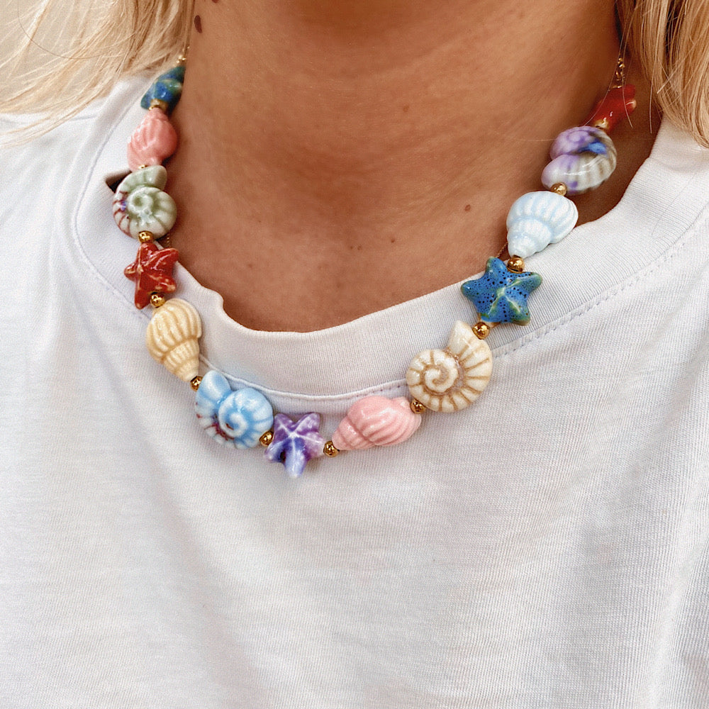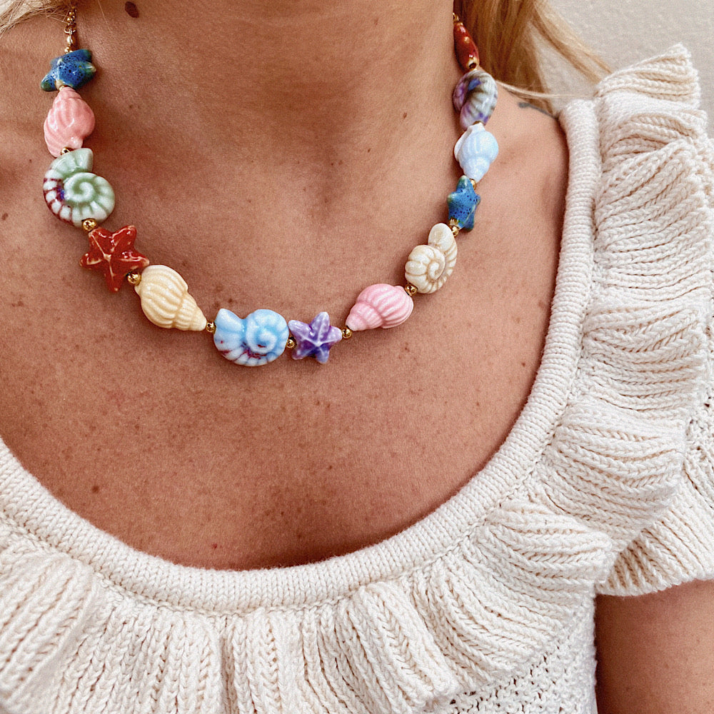 Collana con elementi marini in ceramica smaltata. Catena in acciaio inossidabile.