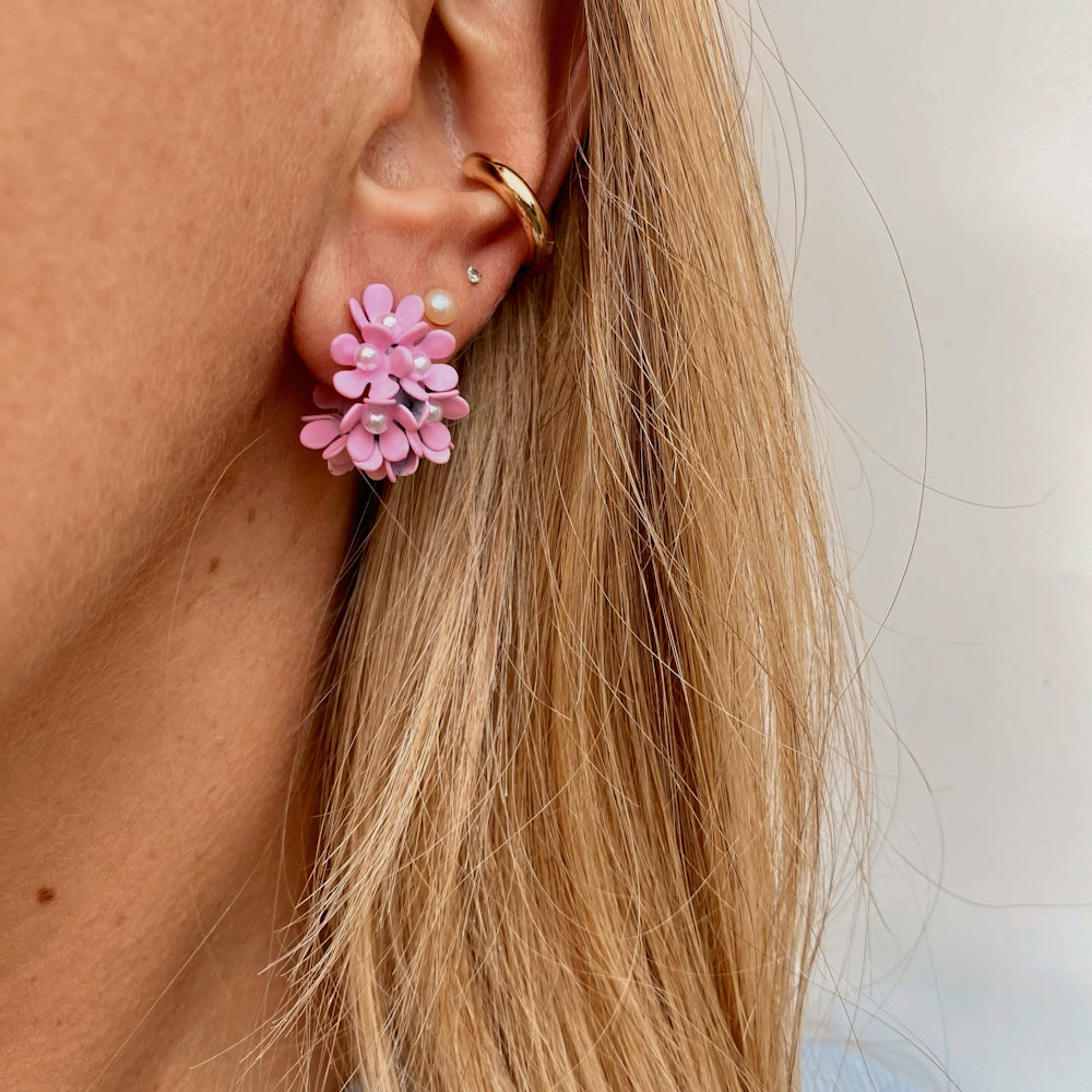 Orecchini semicerchio con microfiori rosa.