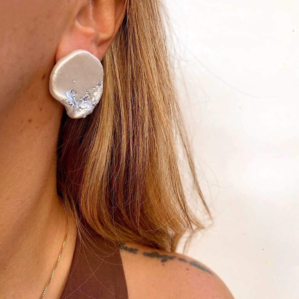 Coppia di orecchini in argilla effetto vinile, fiocchi argento.